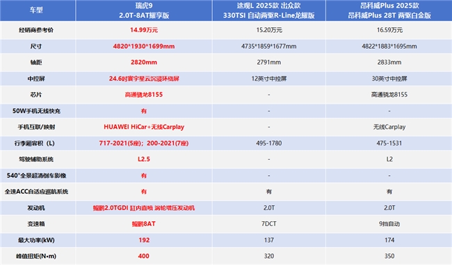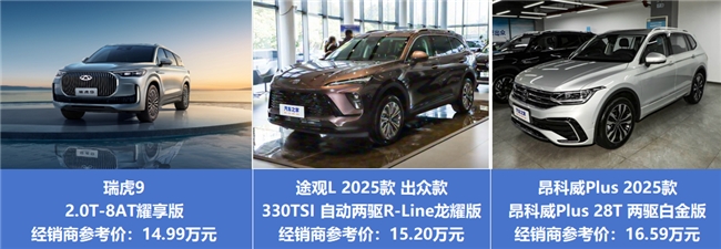 当代用户选车,总容易陷入参数比拼的误区,毕竟单纯的数字罗列,永远无法精准匹配家庭出行的真实需求。既要舒适省心,又得兼顾面子与实用——这才是15万预算家庭选车的核心诉求。如今自主与合资车型百花齐放,谁能真正贴合家庭出行的方方面面?接下来,我们就从生活体验出发,聊聊瑞虎9 2.0T-8AT耀享版(以下简称:瑞虎9)、途观L 2025款 出众款330TSI自动两驱R-Line龙耀版(以下简称:途观L)、昂科威Plus 2025款 昂科威Plus 28T 两驱白金版(以下简称:昂科威Plus),看看谁更懂家庭出行的需求。值得一提的是,目前选购瑞虎9可享20000元购车基金、至高20000元厂家置换补贴、60期超长低息贷款等多重福利,让家庭购车无压力,轻松把舒心座驾开回家。